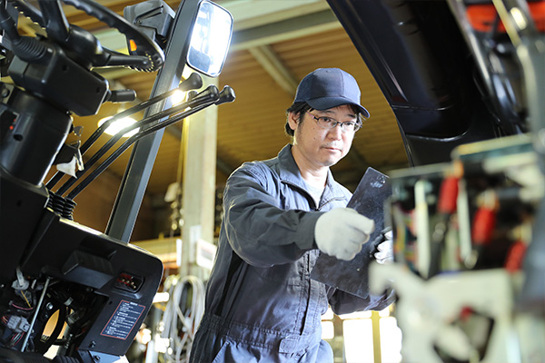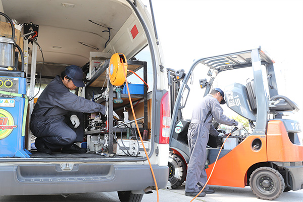 お客様のフォークリフトの突発故障にも、当社サービスマンがお電話一本で、すぐにサービスカーで修理に伺います。車両と積載車によるスピーディな代車手配を実現し、お客様の生産体制を支えます。